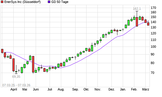 Mit dem Rücksetzer auf 139,40 EUR hat die EnerSys-Aktie am 06.03.2026 die 50-Tage-Linie nach unten gekreuzt.Die EnerSys-Aktie befindet sich seit dem 22.08.2025 im ...weiterlesen