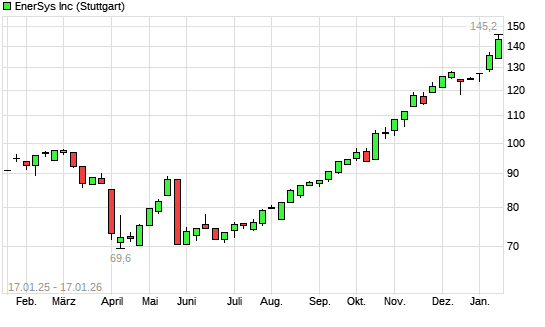 Mit dem Anstieg auf 144,10 EUR hat die EnerSys-Aktie (ISIN US29275Y1029) am 16.01.2026 ein neues All-Time-High erreicht und damit den Kurs vom 14.01.2026 eingestellt.Die EnerSys-Aktie befindet ...weiterlesen