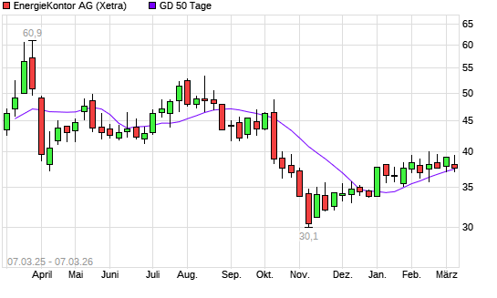 Mit dem Rücksetzer auf 37,30 EUR hat die Energiekontor-Aktie am 06.03.2026 die 50-Tage-Linie nach unten gekreuzt.Die Energiekontor-Aktie befindet sich seit dem 09.10.2025 ...weiterlesen