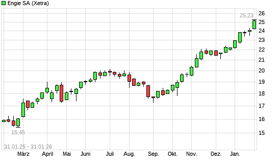 Mit dem Anstieg auf 25,16 EUR hat die Engie-Aktie (ISIN FR0010208488) am 30.01.2026 ein neues 10-Jahres-Hoch erreicht und damit den Kurs vom 28.01.2026 eingestellt.Die Engie-Aktie befindet sich ...weiterlesen