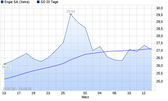 Mit dem Anstieg auf 27,69 EUR hat die Engie-Aktie am 12.03.2026 die 20-Tage-Linie nach oben gekreuzt.Die Engie-Aktie befindet sich seit dem 09.09.2025 im langfristigen Aufwärtstrend ...weiterlesen
