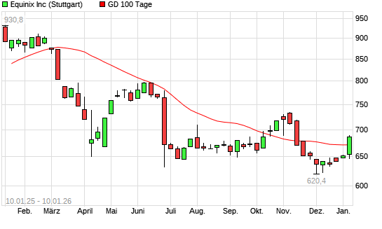Mit dem Anstieg auf 674,60 EUR hat die Equinix-Aktie am 09.01.2026 die 100-Tage-Linie nach oben gekreuzt.Die Equinix-Aktie befindet sich seit dem 07.03.2025 im langfristigen Abwärtstrend und ...weiterlesen