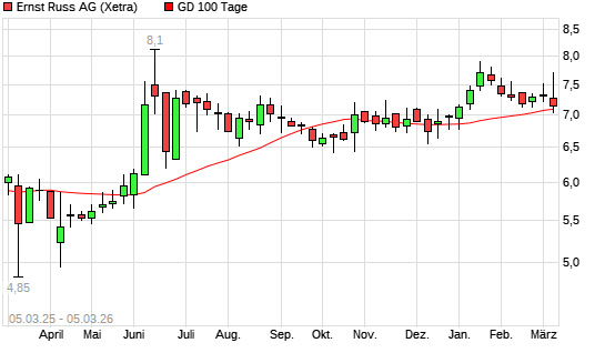 Mit dem Rücksetzer auf 7,06 EUR hat die Ernst Russ-Aktie am 04.03.2026 die 100-Tage-Linie nach unten gekreuzt.Die Ernst Russ-Aktie befindet sich seit dem 21.05.2025 im ...weiterlesen
