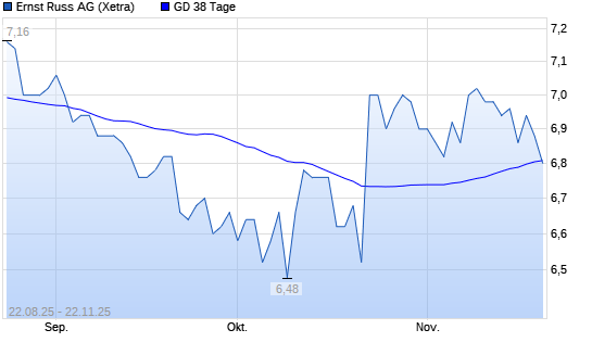 Mit dem Rücksetzer auf 6,76 EUR hat die Ernst Russ-Aktie am 21.11.2025 die 38-Tage-Linie nach unten gekreuzt.Die Ernst Russ-Aktie befindet sich seit dem 21.05.2025 im langfristigen Aufwärtstrend ...weiterlesen