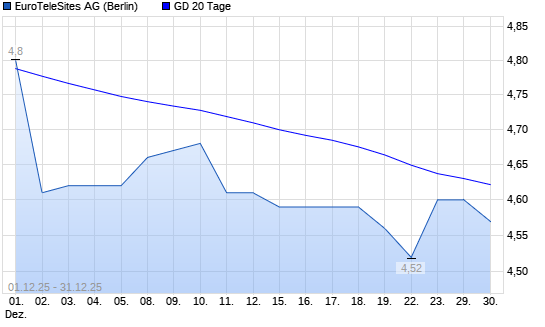 Mit dem Anstieg auf 4,55 EUR hat die EuroTeleSites AG-Aktie am 30.12.2025 die 20-Tage-Linie nach oben gekreuzt.Die EuroTeleSites AG-Aktie befindet sich seit dem 08.09.2025 im langfristigen Abwärtstrend ...weiterlesen