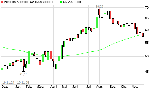 Mit dem Rücksetzer auf 57,42 EUR hat die Eurofins Scientific-Aktie am 18.11.2025 die 200-Tage-Linie nach unten gekreuzt.Die Eurofins Scientific-Aktie befand sich seit dem 10.11.2025 im ...weiterlesen