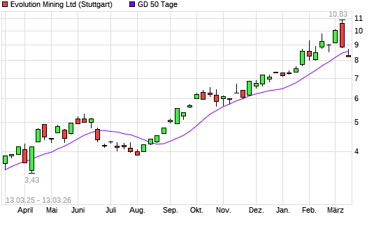 Mit dem Rücksetzer auf 8,56 EUR hat die Evolution Mining-Aktie am 12.03.2026 die 50-Tage-Linie nach unten gekreuzt.Die Evolution Mining-Aktie befindet sich seit dem 03.07.2024 ...weiterlesen