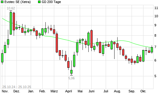 Mit dem Anstieg auf 6,95 EUR hat die Evotec-Aktie am 24.10.2025 die 200-Tage-Linie nach oben gekreuzt.Die Evotec-Aktie befand sich seit dem 13.06.2025 im langfristigen Aufwärtstrend und hat ...weiterlesen
