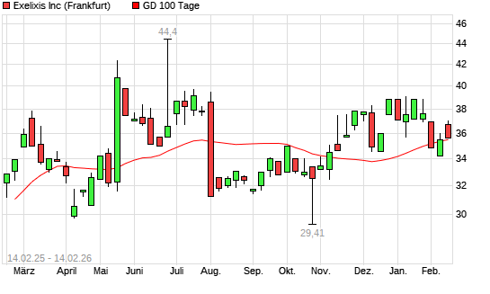 Mit dem Rücksetzer auf 35,60 EUR hat die Exelixis-Aktie am 13.02.2026 die 100-Tage-Linie nach unten gekreuzt.Die Exelixis-Aktie befindet sich seit dem 03.02.2026 im langfristigen Aufwärtstrend ...weiterlesen