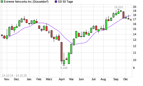 Mit dem Rücksetzer auf 16,76 EUR hat die Extreme Networks-Aktie am 13.10.2025 die 50-Tage-Linie nach unten gekreuzt.Die Extreme Networks-Aktie befindet sich seit dem 17.07.2025 im langfristigen ...weiterlesen