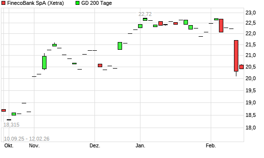 Mit dem Rücksetzer auf 19,57 EUR hat die FinecoBank-Aktie am 13.02.2026 die 200-Tage-Linie nach unten gekreuzt.Die FinecoBank-Aktie befand sich seit dem 15.10.2025 im ...weiterlesen