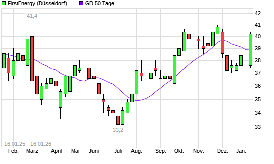 Mit dem Anstieg auf 39,40 EUR hat die FirstEnergy-Aktie am 15.01.2026 die 50-Tage-Linie nach oben gekreuzt.Die FirstEnergy-Aktie befindet sich seit dem 24.09.2025 im langfristigen Aufwärtstrend ...weiterlesen