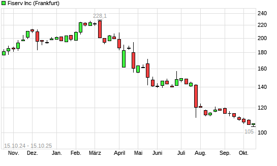 Mit dem Rücksetzer auf 105,00 EUR hat die Fiserv-Aktie (ISIN US3377381088) am 14.10.2025 ein neues 12-Monats-Tief erreicht und damit den Kurs vom 13.10.2025 eingestellt.Die Fiserv-Aktie ...weiterlesen