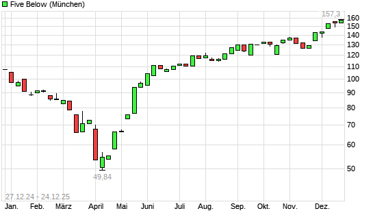 Mit dem Anstieg auf 158,75 EUR hat die Five Below,-Aktie (ISIN US33829M1018) am 23.12.2025 ein neues 12-Monats-Hoch erreicht und damit den Kurs vom 22.12.2025 eingestellt.Die Five Below,-Aktie ...weiterlesen