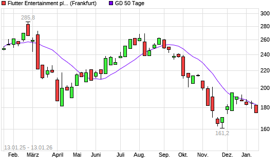Mit dem Rücksetzer auf 181,05 EUR hat die Flutter Entertainment-Aktie am 12.01.2026 die 50-Tage-Linie nach unten gekreuzt.Die Flutter Entertainment-Aktie befindet sich seit dem 25.09.2025 ...weiterlesen