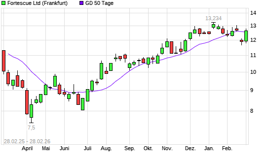 Mit dem Anstieg auf 12,66 EUR hat die Fortescue Metals Group-Aktie am 27.02.2026 die 50-Tage-Linie nach oben gekreuzt.Die Fortescue Metals Group-Aktie befindet sich seit dem 04.08.2025 ...weiterlesen