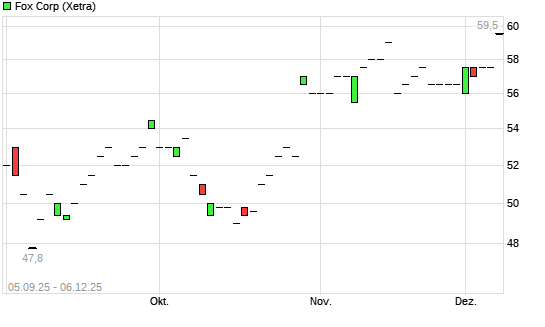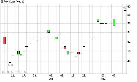 Mit dem Anstieg auf 57,50 EUR hat die Fox Corporation-Aktie (ISIN US35137L1052) am 12.11.2025 ein neues All-Time-High erreicht und damit den Kurs vom 11.11.2025 eingestellt.Die Fox Corporation-Aktie ...weiterlesen