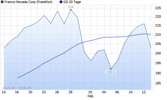 Mit dem Rücksetzer auf 203,00 EUR hat die Franco-Nevada-Aktie am 13.02.2026 die 20-Tage-Linie nach unten gekreuzt.Die Franco-Nevada-Aktie befindet sich seit dem 23.07.2025 im langfristigen ...weiterlesen