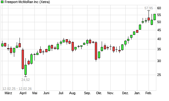 Mit dem Anstieg auf 55,16 EUR hat die Freeport-McMoran Copper-Aktie (ISIN US35671D8570) am 11.02.2026 ein neues All-Time-High erreicht und damit den Kurs vom 03.02.2026 eingestellt.Die Freeport-McMoran ...weiterlesen