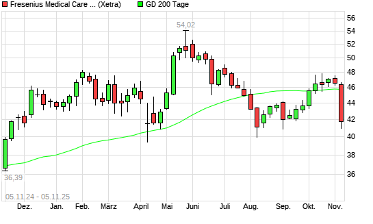 Mit dem Rücksetzer auf 42,00 EUR hat die Fresenius Medical Care-Aktie am 04.11.2025 die 200-Tage-Linie nach unten gekreuzt.Die Fresenius Medical Care-Aktie befand sich seit dem 02.10.2025 ...weiterlesen