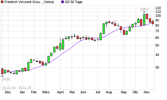 Mit dem Rücksetzer auf 83,60 EUR hat die Friedrich Vorwerk Group-Aktie am 14.11.2025 die 50-Tage-Linie nach unten gekreuzt.Die Friedrich Vorwerk Group-Aktie befindet sich seit dem 16.10.2023 ...weiterlesen