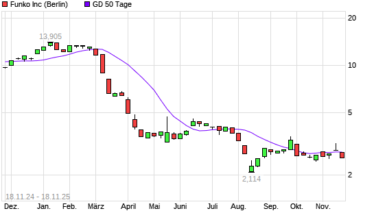 Mit dem Rücksetzer auf 2,65 EUR hat die Funko-Aktie am 17.11.2025 die 50-Tage-Linie nach unten gekreuzt.Die Funko-Aktie befindet sich seit dem 06.03.2025 im langfristigen Abwärtstrend und ...weiterlesen
