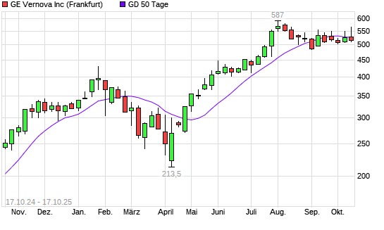 Mit dem Rücksetzer auf 516,00 EUR hat die GE Vernova-Aktie am 16.10.2025 die 50-Tage-Linie nach unten gekreuzt.Die GE Vernova-Aktie befindet sich seit dem 10.04.2025 im langfristigen Aufwärtstrend ...weiterlesen
