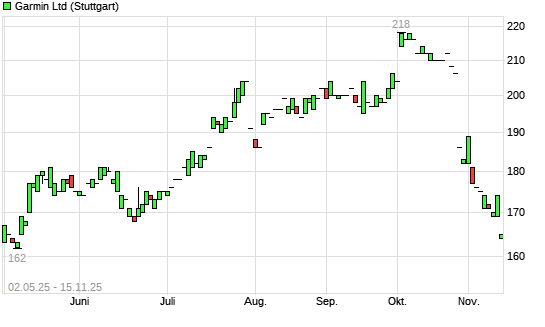 Mit dem Anstieg auf 169,00 EUR hat die Garmin-Aktie am 02.12.2025 die 20-Tage-Linie nach oben gekreuzt.Die Garmin-Aktie befindet sich seit dem 29.10.2025 im langfristigen Abwärtstrend und hat ...weiterlesen