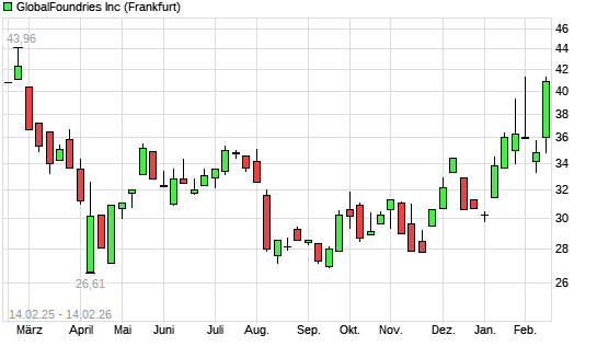 Mit dem Anstieg auf 41,19 EUR hat die GlobalFoundries-Aktie (ISIN KYG393871085) am 13.02.2026 ein neues 6-Monats-Hoch erreicht und damit den Kurs vom 12.02.2026 eingestellt.Die GlobalFoundries-Aktie ...weiterlesen
