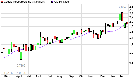 Mit dem Rücksetzer auf 1,90 EUR hat die GoGold Resources-Aktie am 13.02.2026 die 50-Tage-Linie nach unten gekreuzt.Die GoGold Resources-Aktie befindet sich seit dem 10.04.2025 im langfristigen ...weiterlesen
