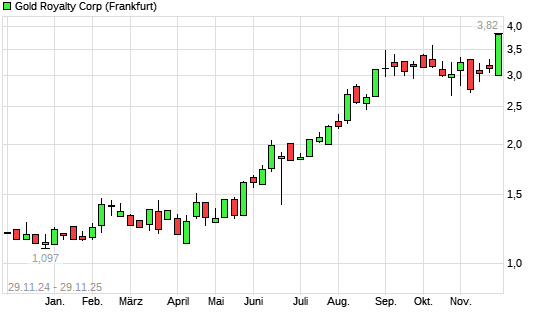 Mit dem Anstieg auf 3,82 EUR hat die Gold Royalty Corp-Aktie (ISIN CA38071H1064) am 28.11.2025 ein neues 3-Jahres-Hoch erreicht und damit den Kurs vom 08.10.2025 eingestellt.Die Gold Royalty ...weiterlesen