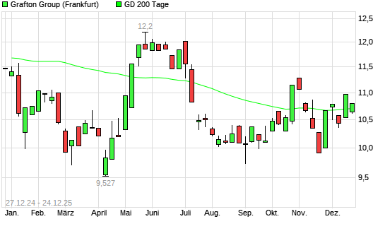 Mit dem Anstieg auf 10,80 EUR hat die Grafton Group-Aktie am 23.12.2025 die 200-Tage-Linie nach oben gekreuzt.Die Grafton Group-Aktie befand sich seit dem 22.12.2025 im langfristigen Abwärtstrend ...weiterlesen