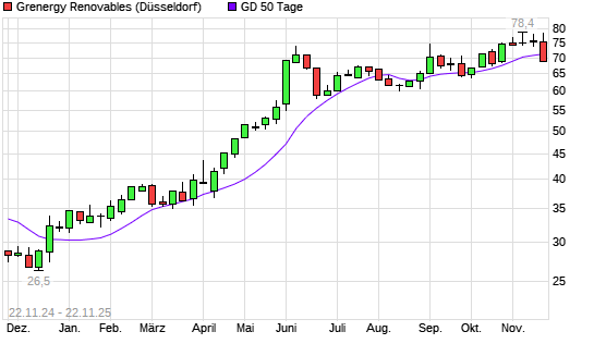 Mit dem Rücksetzer auf 69,20 EUR hat die Grenergy Renovables-Aktie am 21.11.2025 die 50-Tage-Linie nach unten gekreuzt.Die Grenergy Renovables-Aktie befindet sich seit dem 18.12.2024 im ...weiterlesen