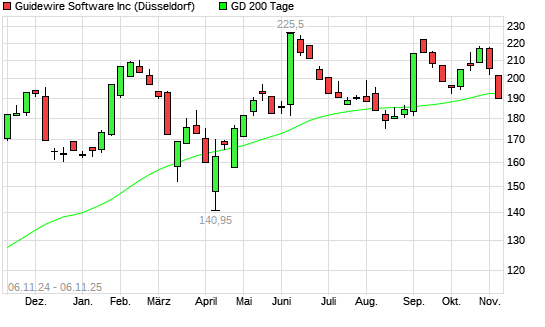 Mit dem Rücksetzer auf 190,65 EUR hat die Guidewire Software-Aktie am 05.11.2025 die 200-Tage-Linie nach unten gekreuzt.Die Guidewire Software-Aktie befand sich seit dem 01.09.2025 im langfristigen ...weiterlesen