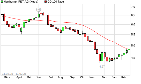 Mit dem Anstieg auf 4,83 EUR hat die Hamborner REIT-Aktie am 10.02.2026 die 100-Tage-Linie nach oben gekreuzt.Die Hamborner REIT-Aktie befindet sich seit dem 27.06.2025 im langfristigen Abwärtstrend ...weiterlesen