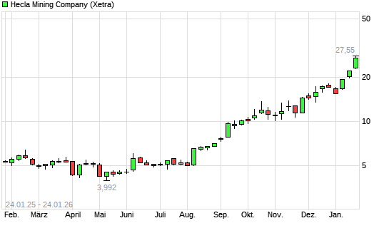 Mit dem Anstieg auf 27,19 EUR hat die Hecla Mining-Aktie (ISIN US4227041062) am 23.01.2026 ein neues All-Time-High erreicht und damit den Kurs vom 22.01.2026 eingestellt.Die Hecla Mining-Aktie ...weiterlesen