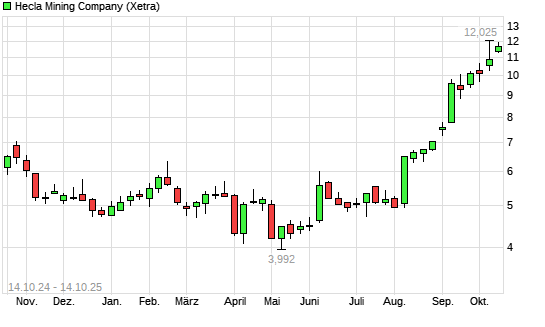 Mit dem Anstieg auf 11,81 EUR hat die Hecla Mining-Aktie (ISIN US4227041062) am 13.10.2025 ein neues All-Time-High erreicht und damit den Kurs vom 08.10.2025 eingestellt.Die Hecla Mining-Aktie ...weiterlesen