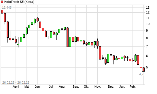 Mit dem Rücksetzer auf 4,74 EUR hat die HelloFresh-Aktie (ISIN DE000A161408) am 25.02.2026 ein neues 12-Monats-Tief erreicht und damit den Kurs vom 24.02.2026 ...weiterlesen