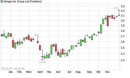 Mit dem Anstieg auf 3,17 EUR hat die Hengan International Group-Aktie (ISIN KYG4402L1510) am 02.12.2025 ein neues 12-Monats-Hoch erreicht und damit den Kurs vom 10.11.2025 eingestellt.Die Hengan ...weiterlesen