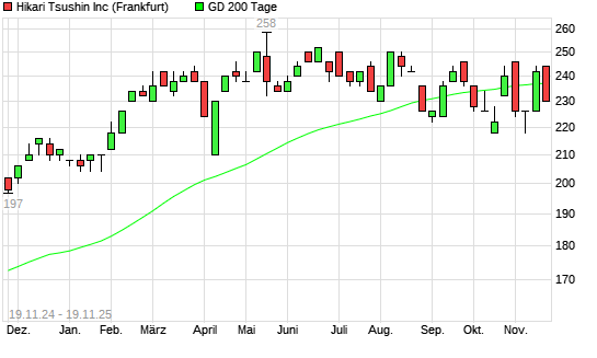 Mit dem Rücksetzer auf 230,00 EUR hat die Hikari Tsushin-Aktie am 18.11.2025 die 200-Tage-Linie nach unten gekreuzt.Die Hikari Tsushin-Aktie befand sich seit dem 12.11.2025 im langfristigen ...weiterlesen