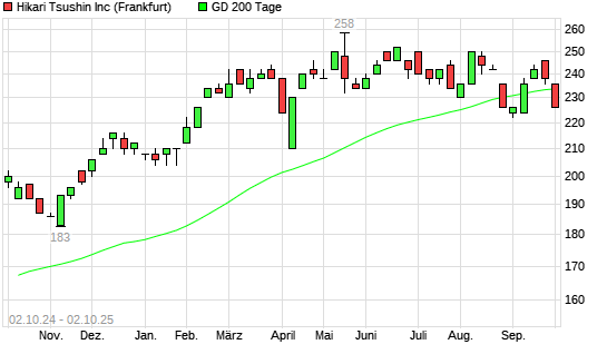 Mit dem Rücksetzer auf 234,00 EUR hat die Hikari Tsushin-Aktie am 01.10.2025 die 200-Tage-Linie nach unten gekreuzt.Die Hikari Tsushin-Aktie befand sich seit dem 10.09.2025 im langfristigen ...weiterlesen