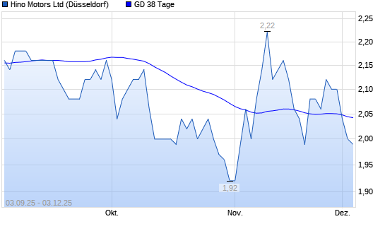 Mit dem Rücksetzer auf 2,04 EUR hat die Hino Motors-Aktie am 02.12.2025 die 38-Tage-Linie nach unten gekreuzt.Die Hino Motors-Aktie befindet sich seit dem 11.06.2025 im langfristigen Abwärtstrend ...weiterlesen
