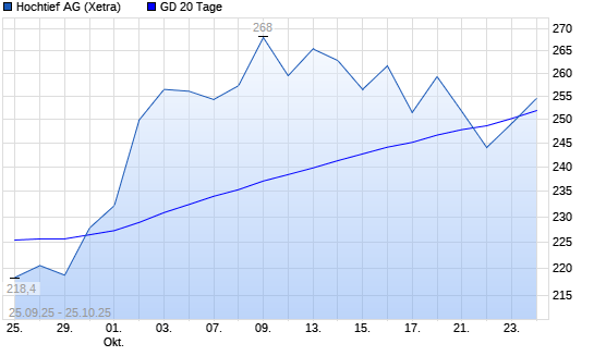 Mit dem Anstieg auf 254,80 EUR hat die Hochtief-Aktie am 24.10.2025 die 20-Tage-Linie nach oben gekreuzt.Die Hochtief-Aktie befindet sich seit dem 24.06.2024 im langfristigen Aufwärtstrend und ...weiterlesen