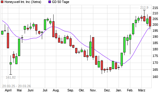 Mit dem Rücksetzer auf 195,48 EUR hat die Honeywell-Aktie am 19.03.2026 die 50-Tage-Linie nach unten gekreuzt.Die Honeywell-Aktie befindet sich seit dem 09.01.2026 im ...weiterlesen