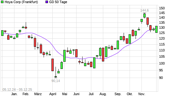 Mit dem Anstieg auf 130,85 EUR hat die Hoya-Aktie am 04.12.2025 die 50-Tage-Linie nach oben gekreuzt.Die Hoya-Aktie befindet sich seit dem 03.09.2025 im langfristigen Aufwärtstrend und hat in ...weiterlesen