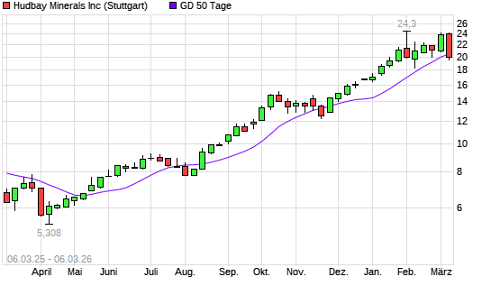 Mit dem Rücksetzer auf 19,87 EUR hat die Hudbay Minerals-Aktie am 05.03.2026 die 50-Tage-Linie nach unten gekreuzt.Die Hudbay Minerals-Aktie befindet sich seit dem 05.08.2025 ...weiterlesen