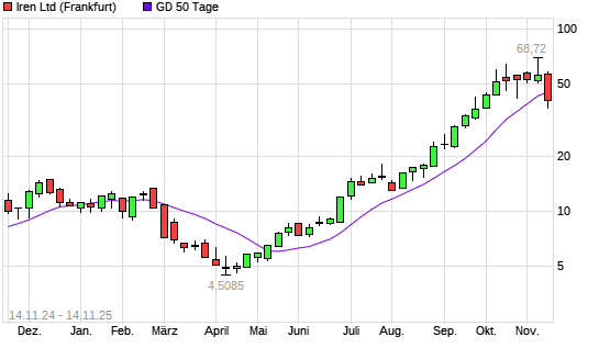 Mit dem Rücksetzer auf 42,05 EUR hat die IREN Limited-Aktie am 13.11.2025 die 50-Tage-Linie nach unten gekreuzt.Die IREN Limited-Aktie befindet sich seit dem 20.06.2025 im langfristigen ...weiterlesen