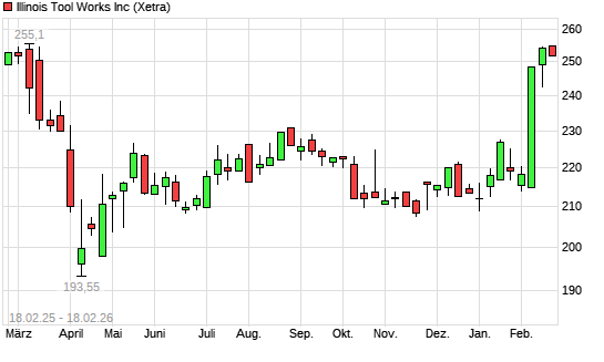 Mit dem Anstieg auf 254,30 EUR hat die Illinois Tool Works (ITW)-Aktie (ISIN US4523081093) am 17.02.2026 ein neues 12-Monats-Hoch erreicht und damit den Kurs vom 03.03.2025 ...weiterlesen