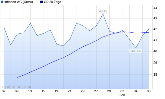 Mit dem Anstieg auf 42,23 EUR hat die Infineon-Aktie am 06.02.2026 die 20-Tage-Linie nach oben gekreuzt.Die Infineon-Aktie befindet sich seit dem 26.11.2025 im langfristigen Aufwärtstrend und ...weiterlesen
