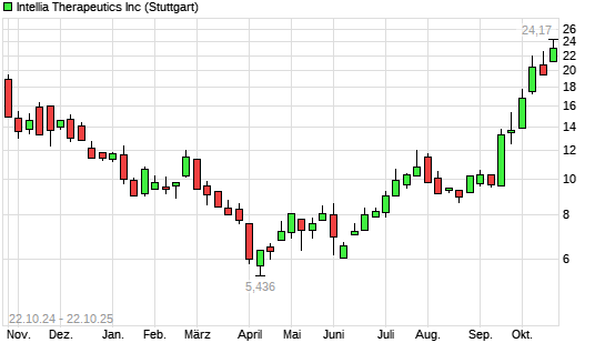 Mit dem Anstieg auf 23,91 EUR hat die Intellia Therapeutics-Aktie (ISIN US45826J1051) am 21.10.2025 ein neues 12-Monats-Hoch erreicht und damit den Kurs vom 09.10.2025 eingestellt.Die Intellia ...weiterlesen
